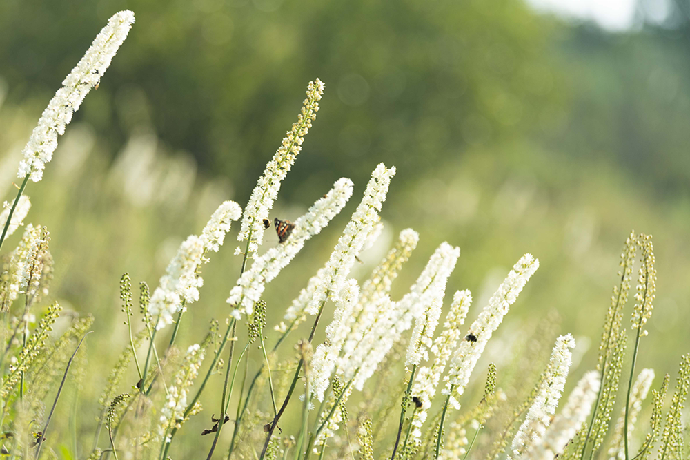 伊吹山山頂のサラシナショウマ群落。8月中旬から9月初旬、白い穂がそよそよと風に揺れながら、斜面いっぱいに広がる。