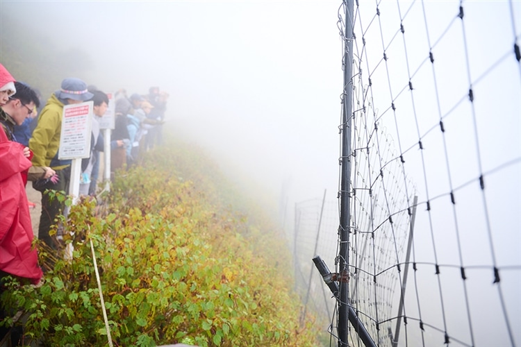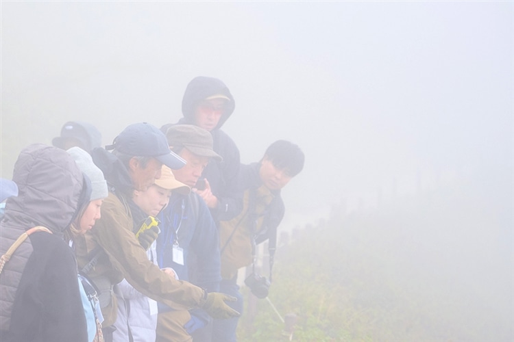 お話を聞いている最中にも空気中の細かな霧は気がつかないうちに髪や服に付着し、粒は水滴へと変わり、雫となってポタポタと落ちていました。植生がなければ、このような水を山は受け止めることができません。逆に言えば、これだけ霧や雨が豊かな伊吹山は、植物にとって重要な水分の供給源になってもいます。伊吹山の豊かな植生を取り戻すことは、伊吹山らしい自然環境を再生することに直結するのだと、霧の中で私たちは深く実感しました。
