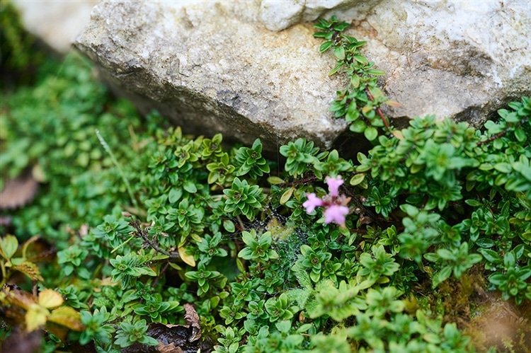 頂上付近に多く見られるイブキジャコウソウ。別名「百里香」は香りが強いことに由来し、シカが好まない。このような植物たちが山の水分を地中に染み込ませる働きもする
