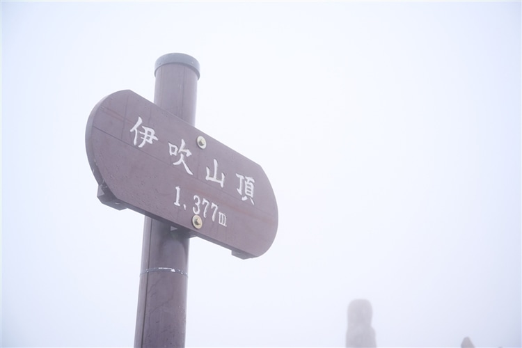登山道を登っていき、辿り着いた山頂も一面、白い霧に包まれていました。頂上には日本武尊(ヤマトタケルノミコト)の像が建てられていて、高橋さんはこんな印象深い伊吹山にまつわる神話を教えてくれました。それは、伊吹山の白猪の神が降らせた氷雨に打たれ、その後日本武尊が命を落としたという伝説。「これは、伊吹山の気象条件がいかに厳しいかを象徴しているのではないかと思うんです」。