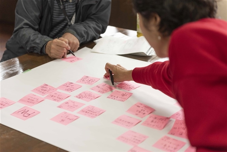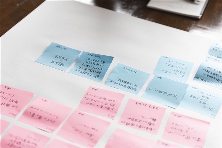 白い模造紙の上に、付箋が少しずつ増えていきます。