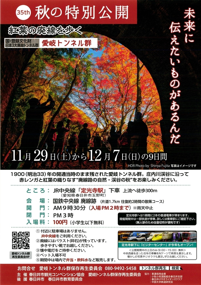 1900(明治33)年の開通当時のまま残された愛岐トンネル群。庄内川渓谷に沿って赤レンガと紅葉の織りなす〝廃線路の自然・渓谷の秋”をお楽しみください。