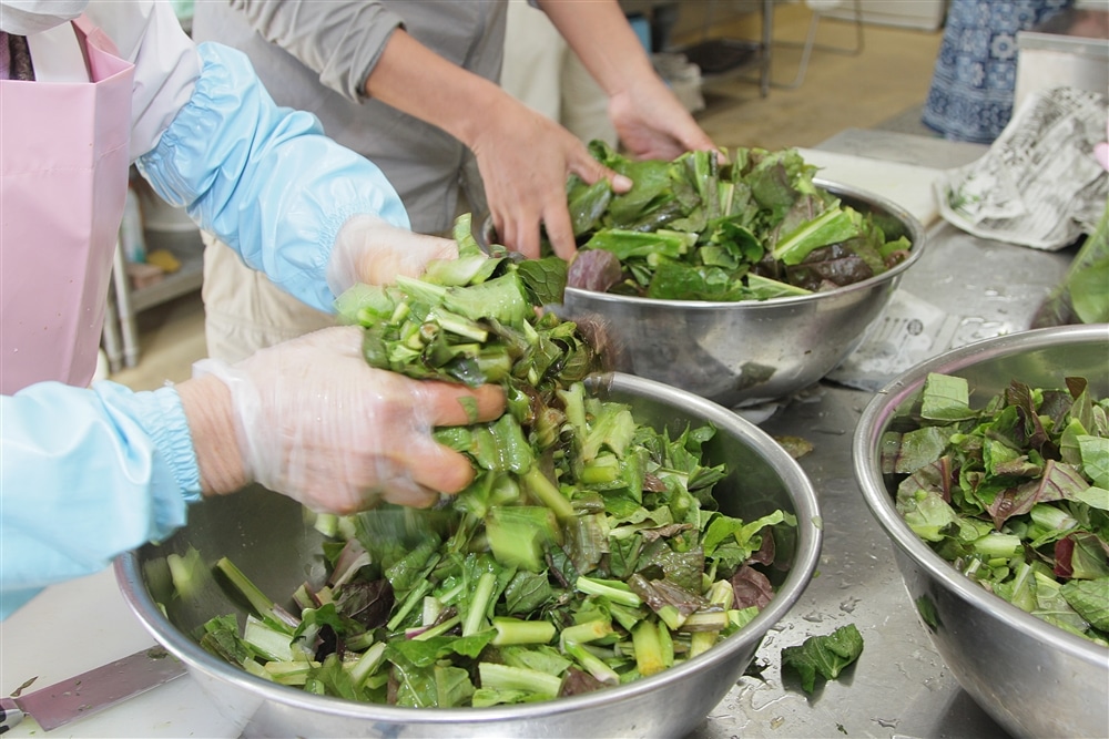 源助かぶ菜を収穫した後は、食べやすいサイズにカット。黄金比の調味料で漬けもみします。