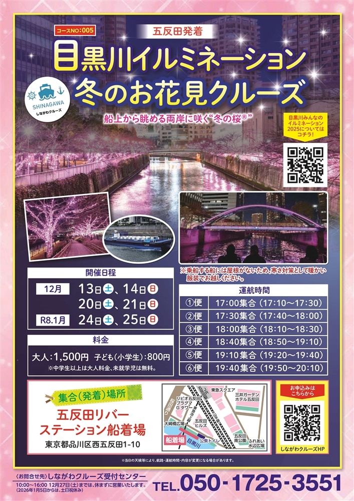 点灯期間中、しながわクルーズ特別便「目黒川イルミネーション 冬のお花見クルーズ」が運航します。船上から眺める幻想的な景色をぜひこの機会にお楽しみください。