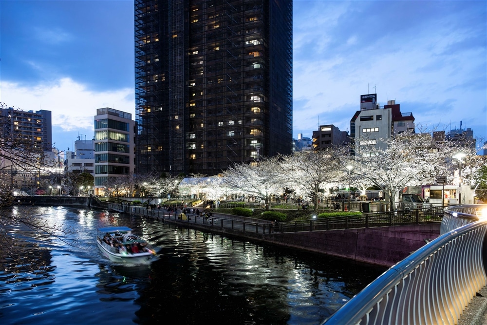 春の訪れを告げる桜が、目黒川の水面に美しく浮かび上がる「五反田ふれあい水辺広場」の夜桜鑑賞をお楽しみください。