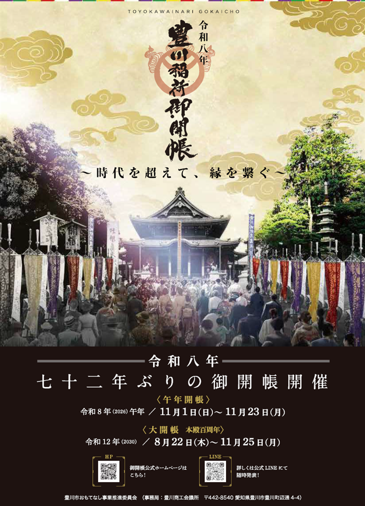 72年ぶりに、秘仏である鎮守・豊川吒枳尼真天(だきにしんてん)の「御開帳」が開催されます。また、令和12年には本殿創建100年を迎えるにあたり「大開帳」も予定されています。