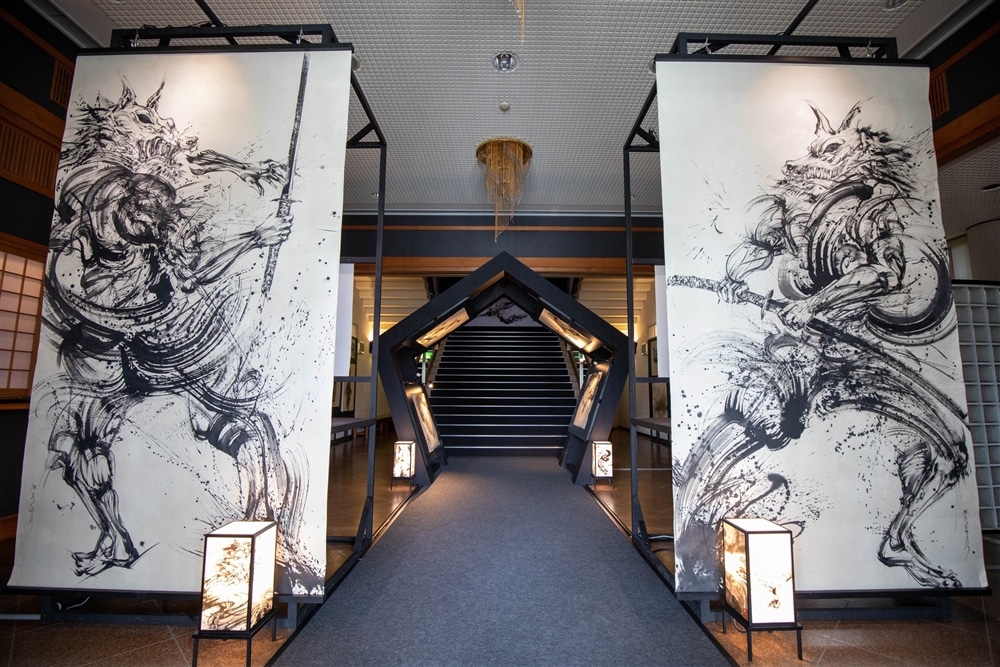 豊川稲荷境内にある旧寺宝館では御開帳を記念し、世界最大級の墨絵ミュージアムである「西元祐貴美術館」が開館しています。約1,700㎡の空間で、墨・光・音が織りなす没入体験を楽しんでいただけます。