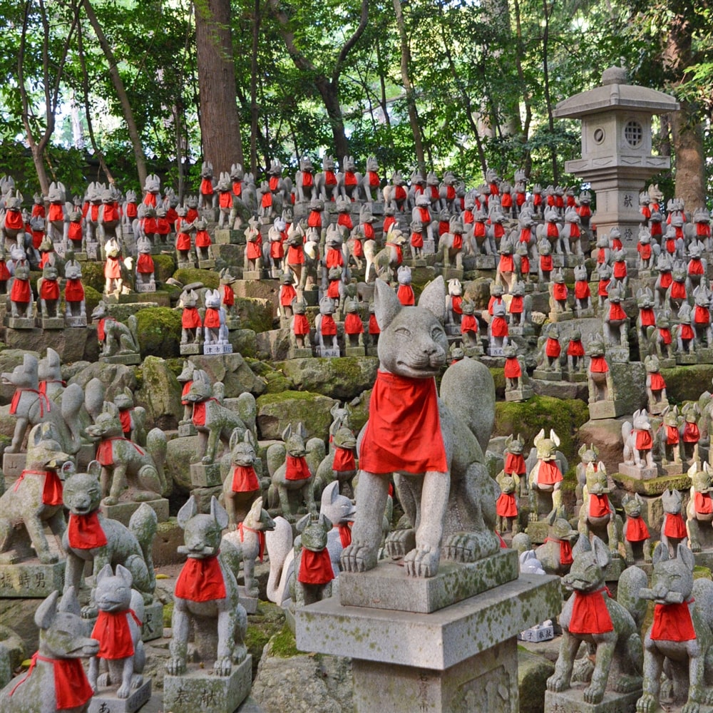 豊川稲荷の境内奥には、本殿のにぎわいとは対照的に、およそ一千体の狐像が立ちならぶ神秘的で幻想的な霊狐塚があります。