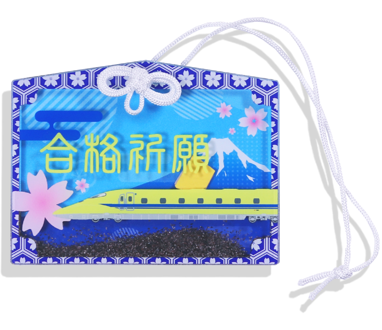 努力が報われますように。試験や受験に挑む皆様の背中を押してくれる合格祈願のお守りです。縁起のよい富士山と満開の桜を背景に、疾走するドクターイエロー(T4編成)をデザインしました。