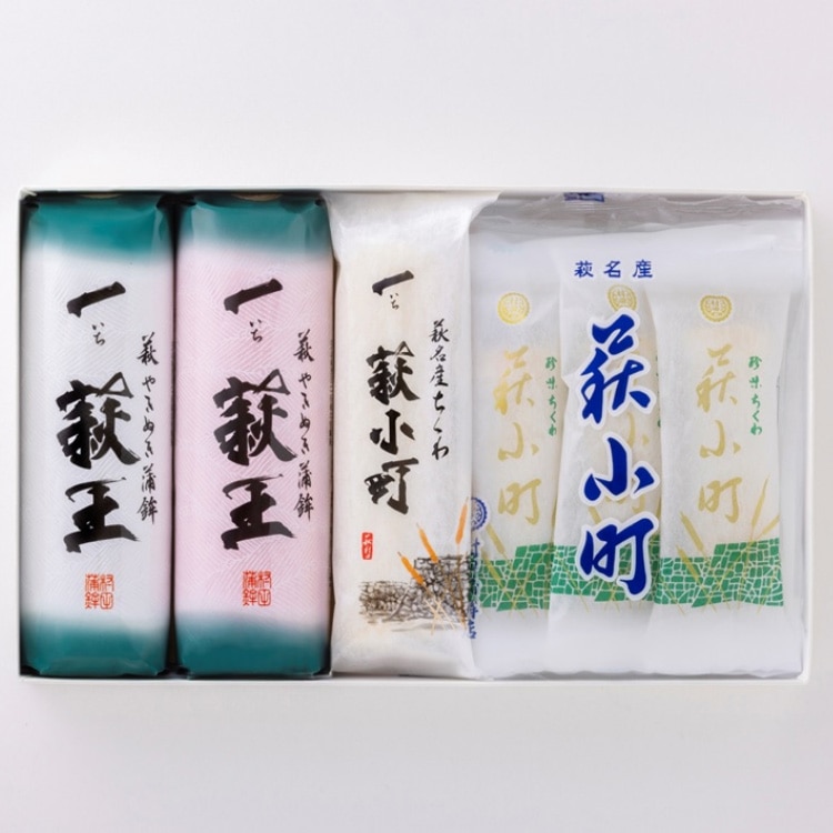 | 内容量:一萩王かまぼこ大(白・紅)各160g×1個、一萩小町ちくわ1本入×1・萩小町ちくわ3本入×1個