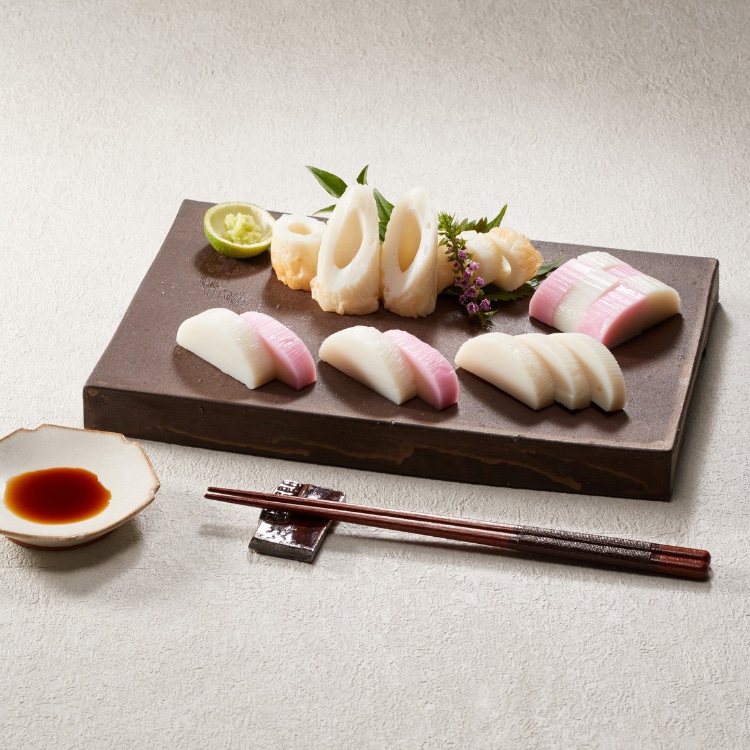 鮮度の高い素材を使い、山口県萩市の伝統やきぬき製法で作られた力強い弾力が人気の『萩王』の紅白蒲鉾と創業当時より親しまれ、肉厚とみずみずしさが魅力の焼ちくわ『萩小町』を詰め合わせました。