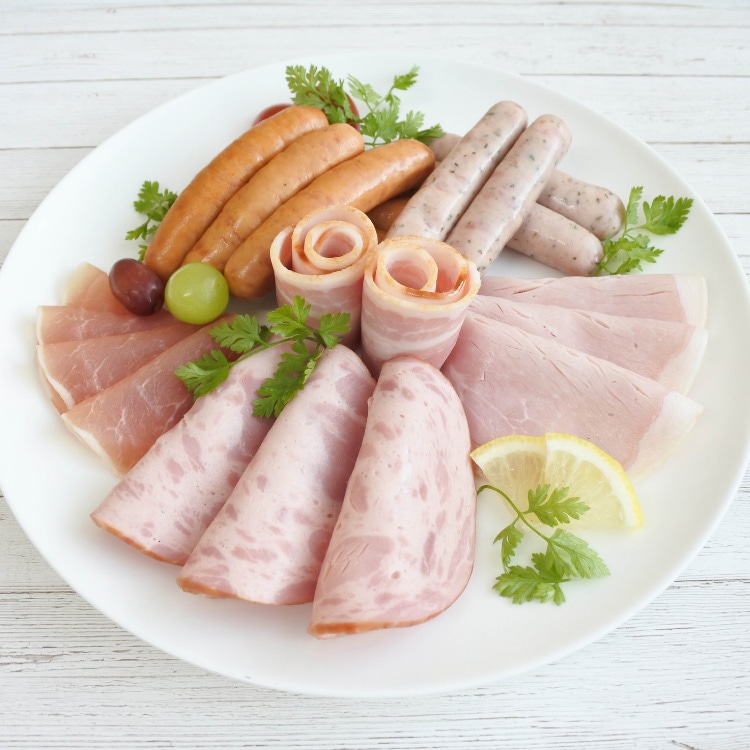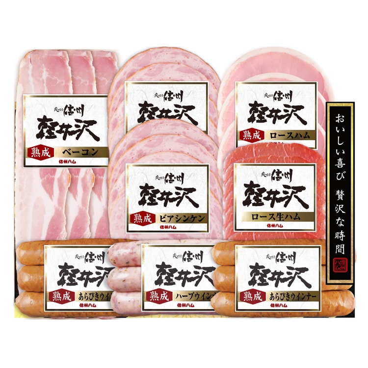 | 内容量:熟成ビアシンケン60g・熟成あらびきウインナー58g×各2、熟成ロースハムスライス42g・熟成ベーコンスライス45g・ロース生ハムスライス30g・熟成ハーブウインナー58g×各1