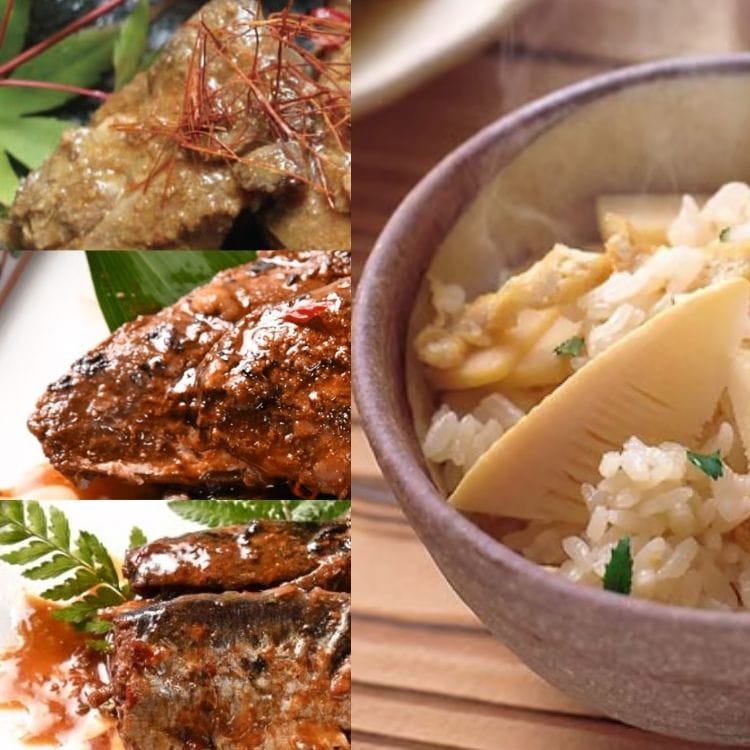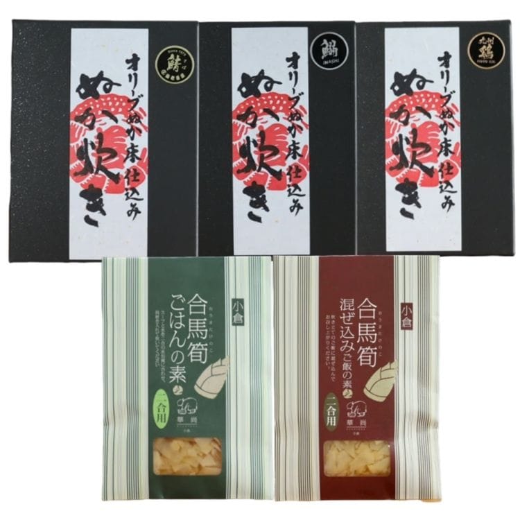 北九州「合馬産」の筍を使用した風味豊かなご飯の素と小倉の郷土料理「ぬか炊き」3種を詰合せました。