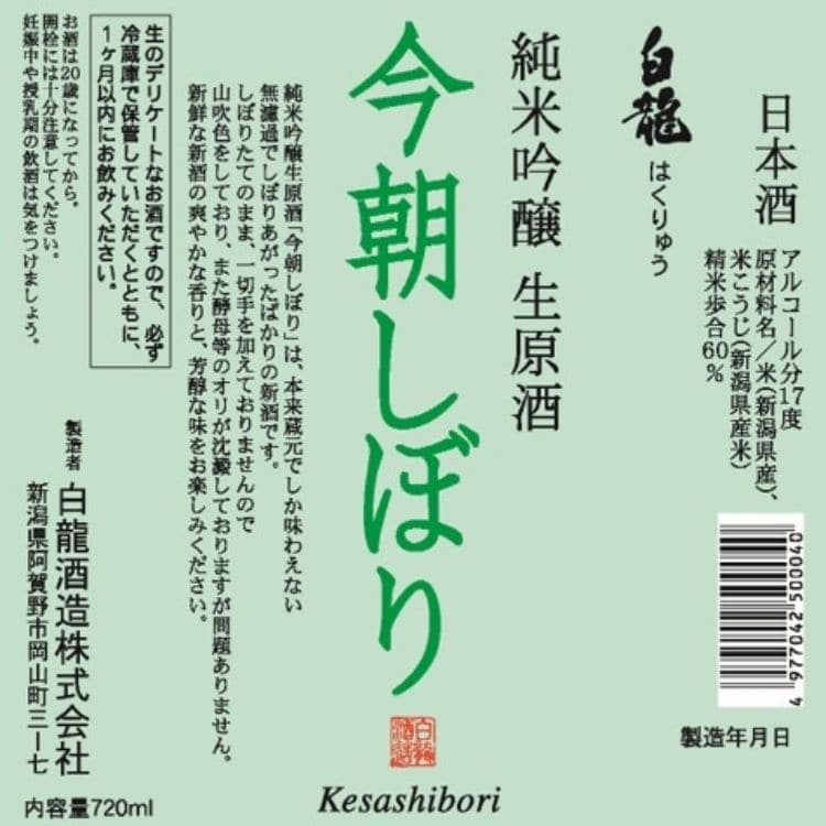 【11月13日店頭受取】【新潟県】白龍 純米吟醸生原酒 今朝しぼり720ml(白龍酒造) ※10月31日注文受付締め切り