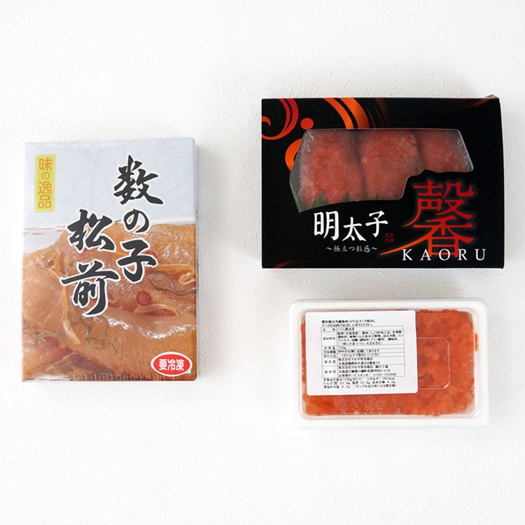 | 内容量:いくら醤油漬け100g×1、数の子松前漬け200g×1、辛子明太子250g×1