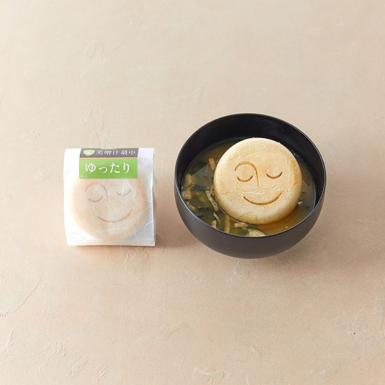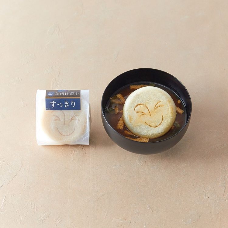 美噌汁最中は味噌と具材が最中に入ってます。お湯を注げば本格的な味噌汁がすぐ完成。