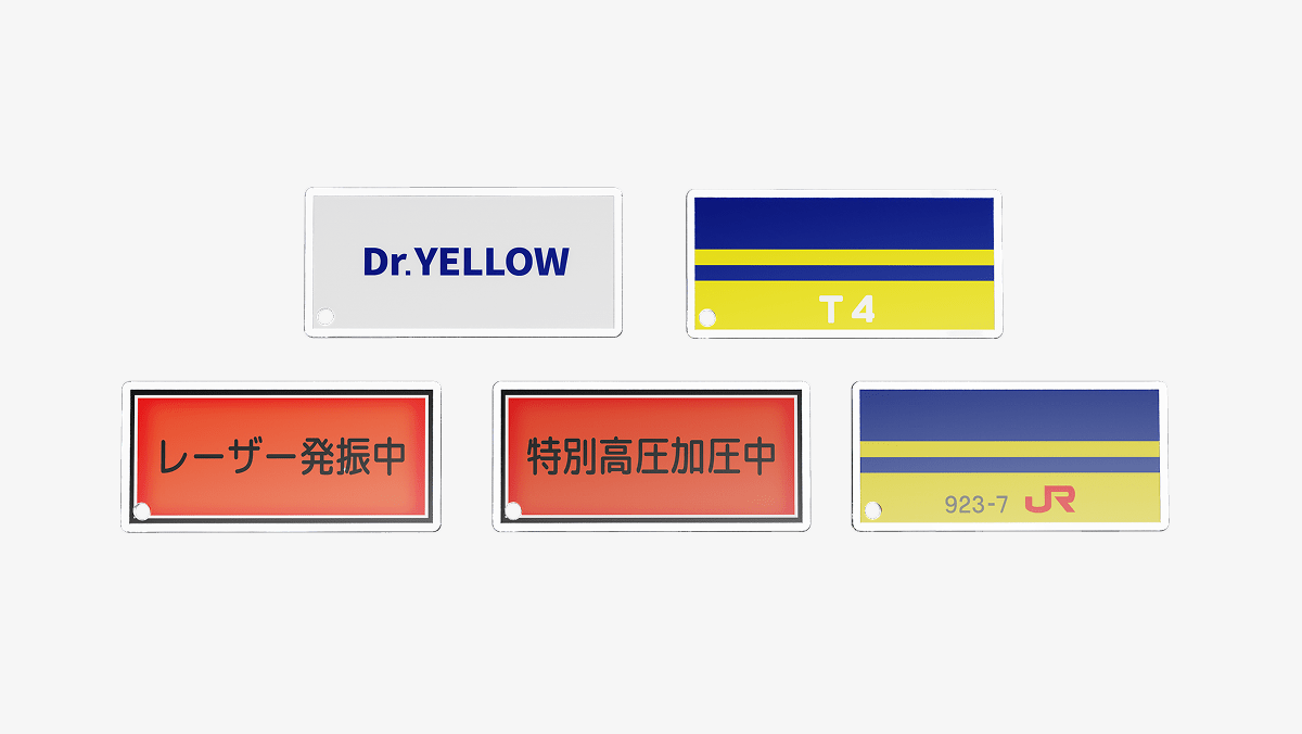 ドクターイエローの車内に設置されていた標識などを再現したアクリルキーホルダーが、なんと全種類(全5種)付いてくるサプライズ特典もご用意!