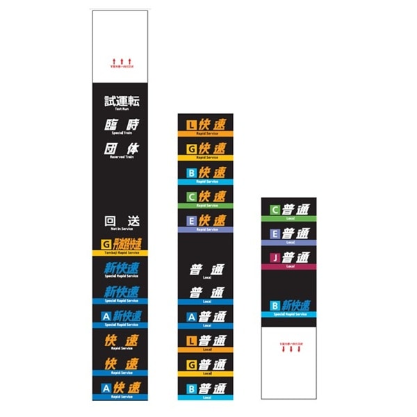 試運転、臨時、団体、回送、新快速(無地・A・B)、快速(A・B・C・E・L・G)、普通(A・B・C・E・L・G・J)、丹波路快速