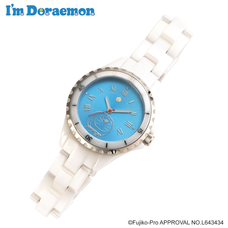 「I'm Doraemon」からドラえもんをイメージしたカラーリング・モチーフを散りばめたセラミックウォッチ登場 水色の文字盤にさりぎなくあしらわれた笑顔のドラえもんと、ゴールドの鈴が描かれたシンプルでさわやかなデザイン。赤い秒針はドラえもんの鼻としっぽをイメージしました。12時、3時、9時の位置にはクリスタルガラスが配置されています。 大人になっても大好きなドラえもんと一緒にいられるデザインをイメージ。長く愛用していただけるよう、肌に優しくキズや変色にも強いセラミック素材を採用しました。 限定生産数100本の貴重なモデルです。