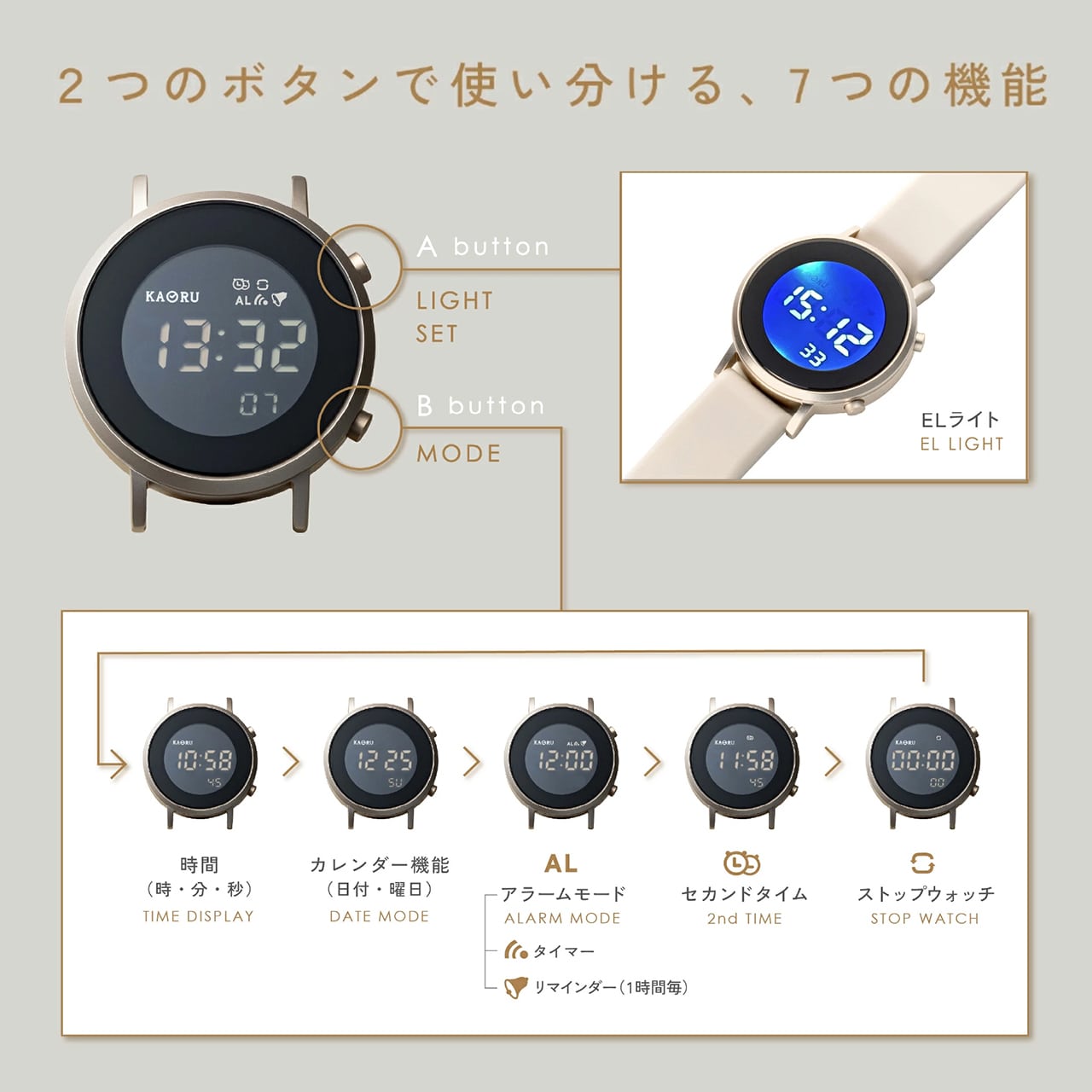 - ◯軽くてつけやすく、幅広い対応サイズ レディス・メンズ問わず使える、手首周り約12.5cmから21cm。本体のケースはアルミ素材なので極軽量の約40g。 程よいサイズ感で見やすく普段使いにも便利で、ペアウォッチとしても使えるアイテムです。 ◯2つのボタンで使い分ける、7つの機能 通常の時計表示、カレンダー表示、アラーム(タイマー・1時間ごとのリマインダー)、セカンドタイム、ストップウォッチ、ELライトの機能を搭載。2つのボタンで切り替えスマートに使用できます。