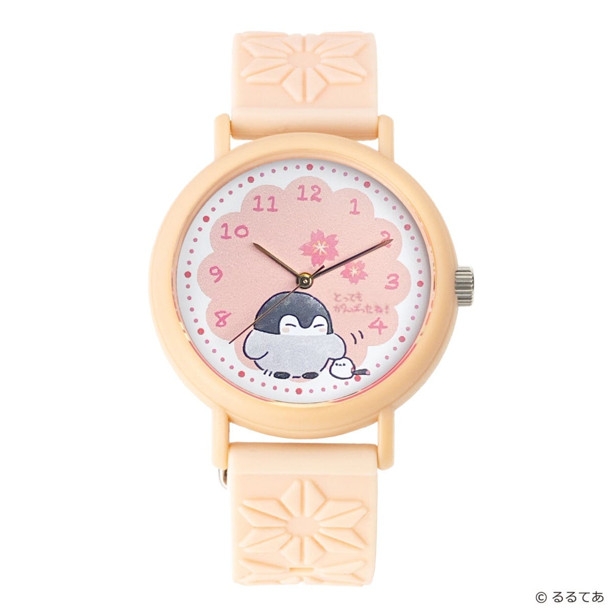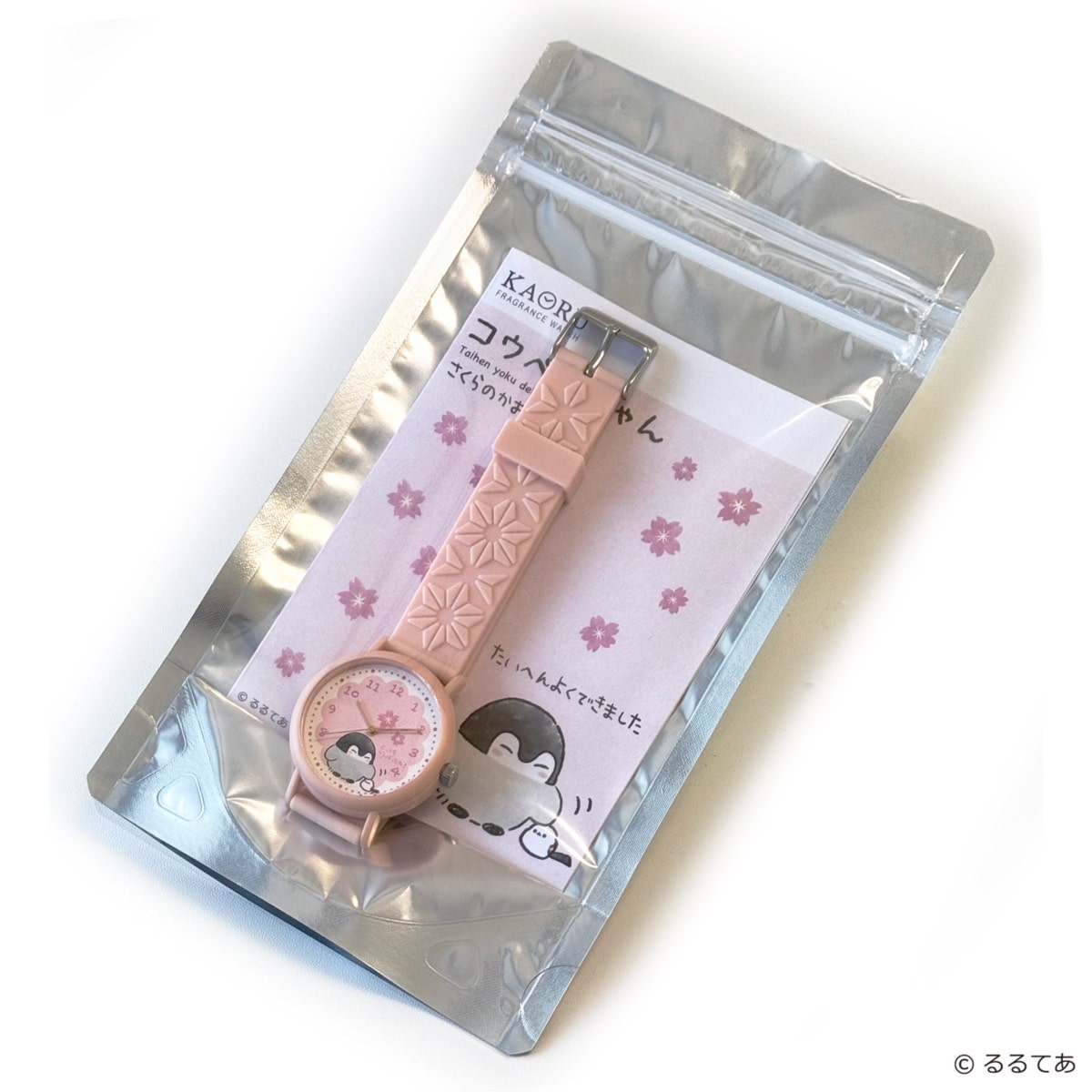 シリコンバンドからほんのり優しくさくらが香る和のフレグランスと癒しのアートを、いつでもお守りのように身につけられるコウペンちゃんの腕時計です。「とってもがんばったね!」のセリフと邪エナガさんをなでなでするコウペンちゃんのアート、裏蓋には「たいへんよくできました」と癒しのメッセージが寄り添ってくれます。