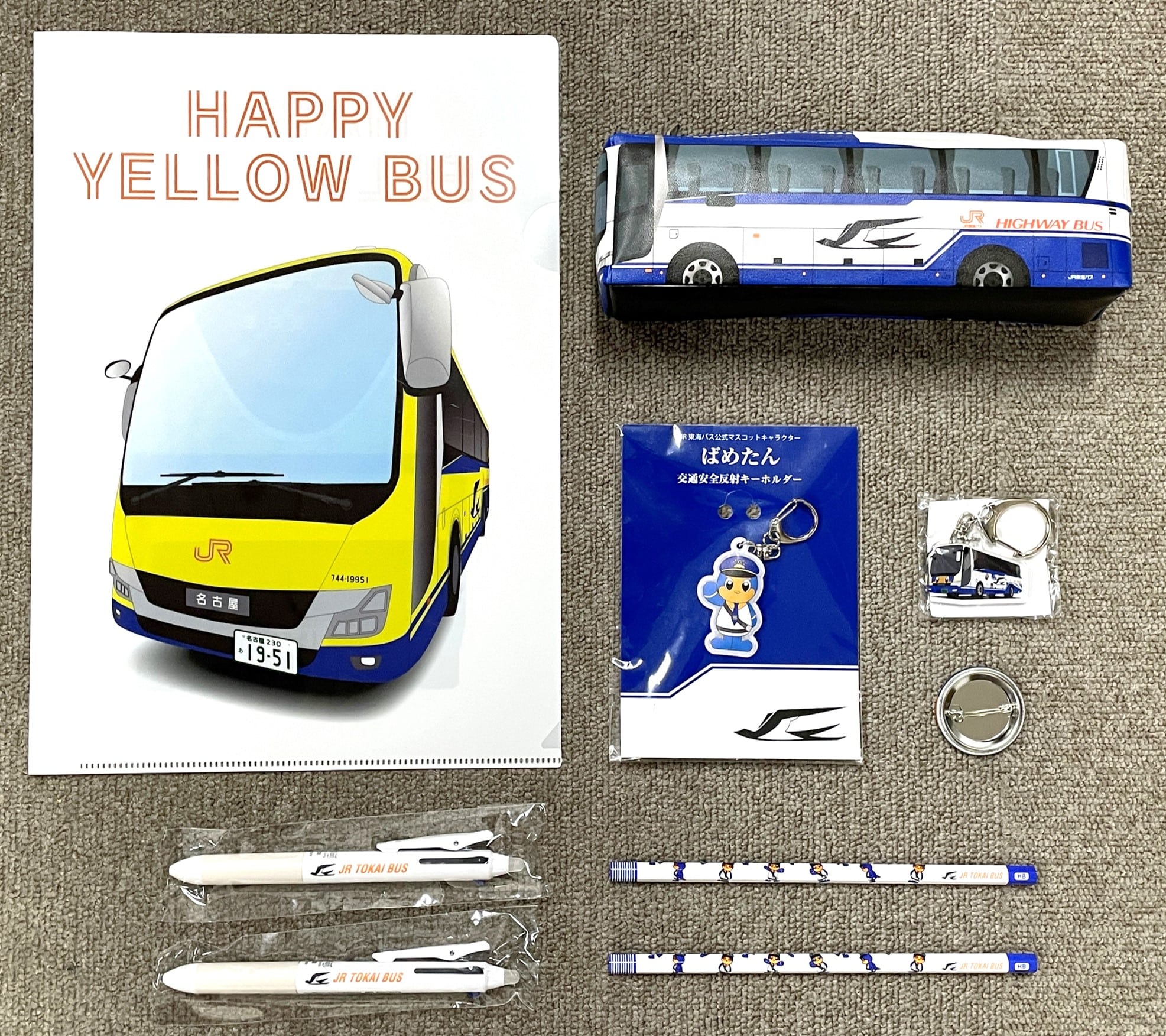 ペンケース(高速バス)・アクリルキーホルダー(5種の中から1つ[種類は指定できません])・ばめたん鉛筆(2本)・フリクション(2本)・オリジナルクリアファイル・交通安全キーホルダー(ばめたん)・シークレット「合格祈願(缶)バッチ」