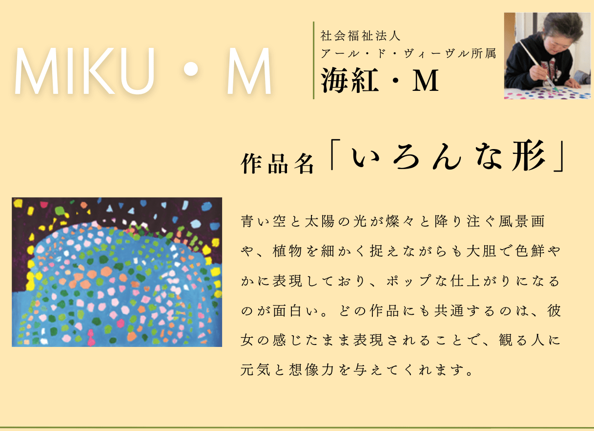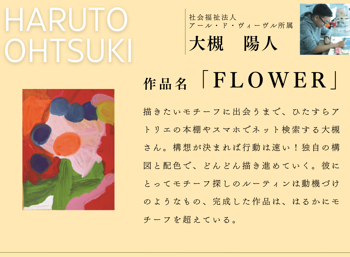 ※「アール・ブリュット」とは「生(き)の芸術」を意味するフランス語で専門的な教育を受けていない人による芸術や表現の総称として用いられています。障がいのあるアーティストによる芸術作品も含まれています。