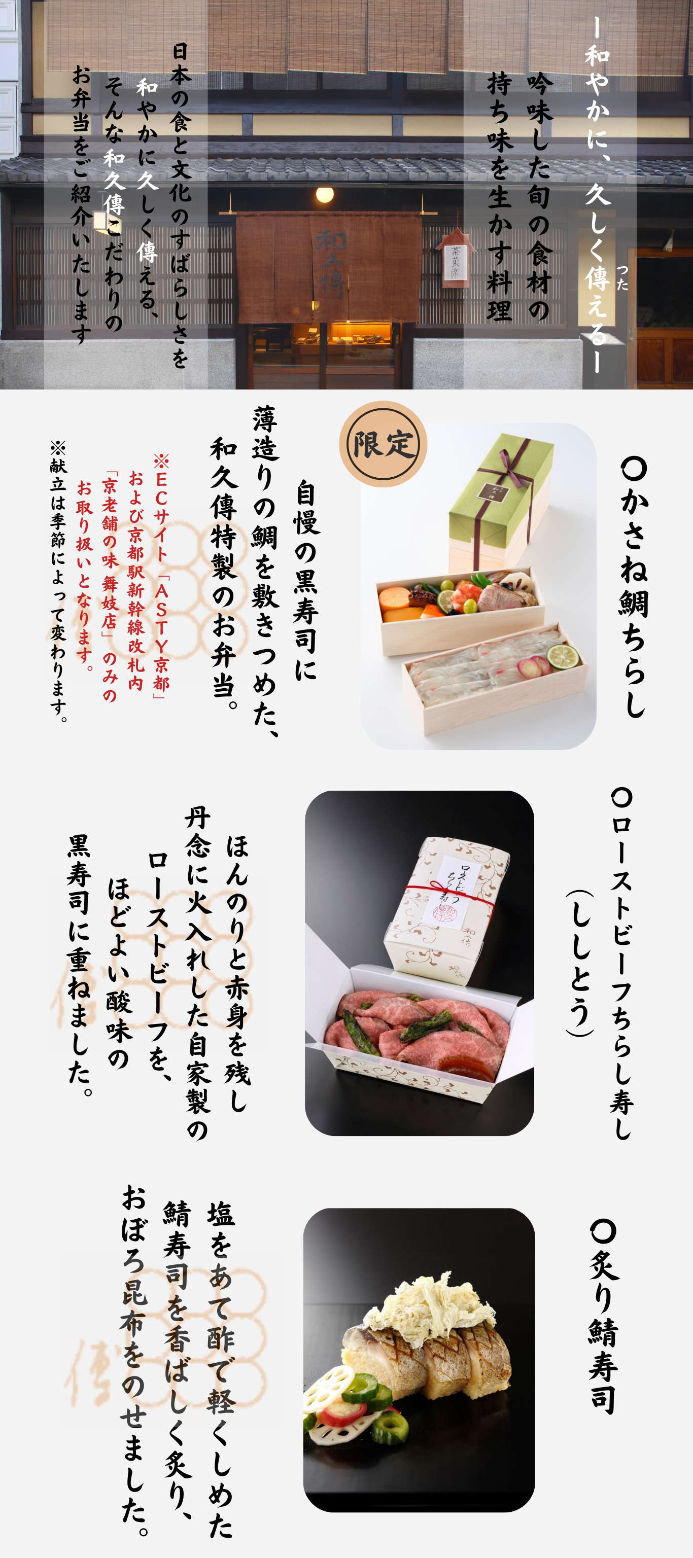 【ここでしか買えない!】和久傳こだわりのお弁当3商品をご紹介! かさね鯛ちらしのご購入はこちら かさね鯛ちらしの(異なる日付)のご購入はこちら ローストビーフちらしのご購入はこちら ローストビーフちらし(異なる日付)のご購入はこちら 炙り鯖寿司のご購入はこちら 炙り鯖寿司(異なる日付)のご購入はこちら